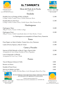 Menú del Deck de la Noche Ensaladas Hamburguesas Pastas